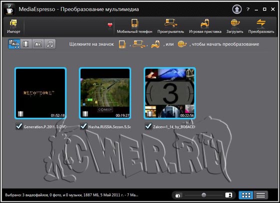 Конвертирование данных в нужный формат выполняется в автоматическом режиме без предварительной настройки параметров. MediaEspresso 6 автоматически определяет модель мобильного устройства, подключенного к ПК, и выбирает соответствующий профиль оборудования, не требуя от пользователя настройки параметров вручную.