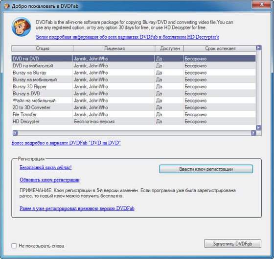DVDFab – мощный, многофункциональный программный продукт для копирования DVD дисков с возможностями гибкой обработки видеопотока. Программа является одной из лучших на сегодняшний день, из инструментов для копирования, разбиения, пережатия и конвертирования DVD дисков с фильмами. Снимает все защиты и ограничения с диска и при желании пережмет диск большой емкости и вместит его в обыкновенную пустую DVD болванку с минимальными потерями качества (DVD9->DVD5) или разобьет фильм на два диска с полным переносом его меню, удалит всю рекламу, запишет только фильм и многое другое. Программа имеет интуитивно понятный, мультиязычный интерфейс включая русский.
