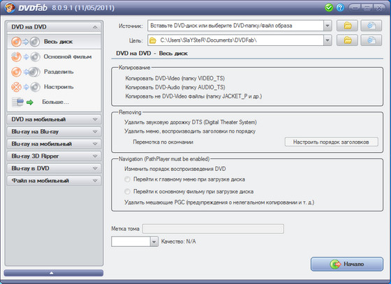 - Копировать на чистый DVD диск любого формата(DVD+R/RW, DVD-R/RW, DVD+R DL, DVD-R DL).