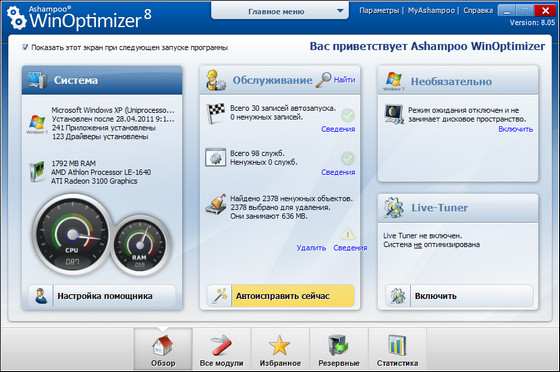 Скачать программу Ashampoo WinOptimizer 8.05 RePack (7,72 МБ):