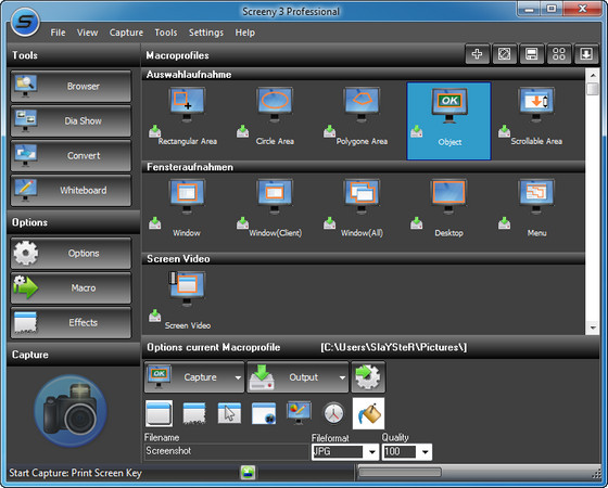 Screeny 3 Professional, the software for individuals, is a very powerful tool for professional desktop screenshots and videos, which you can hold everything from your screen as an image or video. Screeny 3 is the screenshot program for professional screen shots, even from DirectX games, with innovative and comprehensive recording and transmission facilities. Send your recording directly from Screeny by e-mail to your colleagues, or to an FTP server or save your recording directly from a PDF file with Screeny 3 thats no problem .
