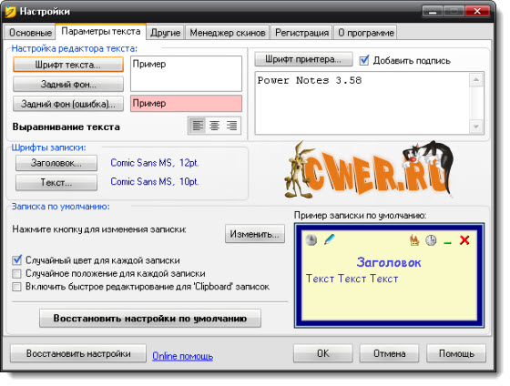 Отдельно хочется рассказать о настройке утилиты Power Notes. Дело в том, что при использовании рассматриваемой утилиты пользователь может самостоятельно задать шрифты записок и параметры печати, включить запуск программы вместе с Windows и установить степень прозрачности стикеров. Кроме того, в окне настроек можно выбрать проигрываемые для основных событий звуки, включить случайный выбор цветовой схемы и местоположения на экране "наклейки" при ее создании, настроить "горячие" клавиши, с помощью которых пользователь сможет быстро создавать новые стикеры, вызывать редактор, а также окно настроек рассматриваемой утилиты. Кроме того, среди параметров программы есть пункты, отвечающие за ее внешний вид. Так, например, пользователь может выбрать скин главной панели, а также язык интерфейса.