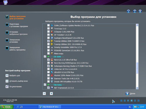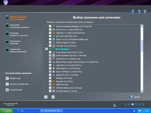 Вам надоело каждый раз после переустановки Винды долго и нудно устанавливать все необходимые программы? Они разбросаны где-то на компе, их надо найти, поставить и крякнуть? Обычно эта процедура занимает чуть ли не больше времени чем установка самой операционки, тогда этот образ именно для вас - Вам остается только выбрать необходимые программки и нажать старт, они сами установятся - тихо и без шума! Сборник популярных программ с автоматической установкой, не требующий непосредственного участия пользователя в установке каждой программы. Набор изъят из последней сборки Chip XP за июнь 2011, и упакован в новый образ.