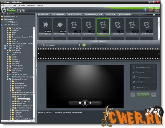 Программа имеет четко структурированный интерфейс с встроенным редактором. В дереве довольно легко найти нужные видео и "оживлять" их в редакторе в соответствии с Вашими желаниями. С помощью всего одного клика мышки можно вращать зеркало или видео. Яркость, контрастность, гамму и насыщенность можно регулировать с помощью ползунков. Для того, чтобы придать Вашему видео особое звучание, Вы можете добавить музыку или попробовать один из профессиональных эффектов. Сделать экшен-видео еще более гениальным путем обращения цветов. Или придайте своему видео элегантность и ностальгии старых фильмов с помощью "старого кино" или эффекта "сепия".