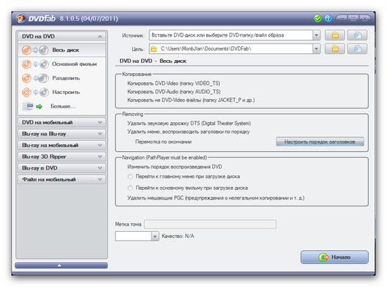 - Копировать на чистый DVD диск любого формата(DVD+R/RW, DVD-R/RW, DVD+R DL, DVD-R DL).