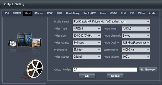 - Один щелчок мышки настраивает профиль и легко настраивает параметры настройки для видео размера, структуру, видео bitrate (качество), аудио bitrate (качество), формат изображения, размер раскола и телевизионный способ.