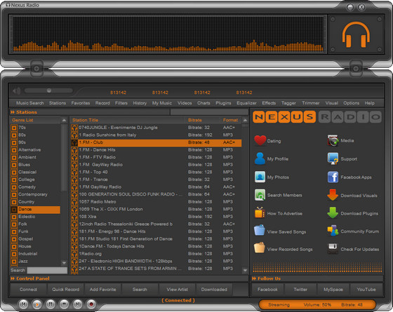 Nexus Radio – не просто плеер онлайн-радио, помимо целого ряда функций и стильного графического интерфейса, программа поддерживает 11,000+ интернет-станций. С помощью Nexus Radio можно не только слушать музыку любого стиля, но и записывать дорожки из эфира в MP3 формат. Никаких трудностей данная операция не вызовет. Трек записывается не только при нажатии на кнопку Record, но и в указанный период времени и даже день.