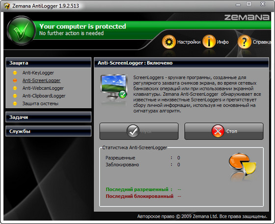 Защита от клавиатурных шпионов (кейлоггеров): Клавиатурные шпионы записывают все, что вы печатаете, следя за символами, введенными с клавиатуры. Это делает большинство средств защиты бесполезными. Однако, Zemana AntiLogger к ним не относится!