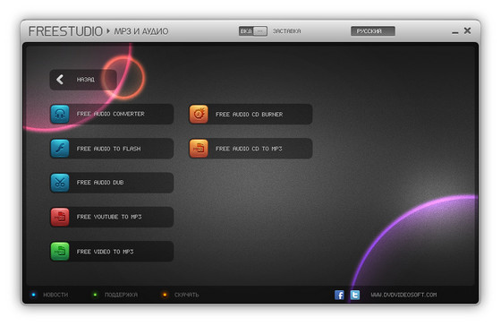 Новый Free Studio Manager - это единый пакет программ в совершенно новом дизайне, объединивший все бесплатные мультимедийные приложения, разработанные DVDVideoSoft. Он состоит из следующих 8 разделов: YouTube, MP3 и Аудио, CD-DVD-BD, DVD и Видео, Фотки, Мобилки, Устройства Apple, 3D. Таким образом, новый интерфейс, включающий в себя все программы, позволяет быстро найти нужную именно вам.