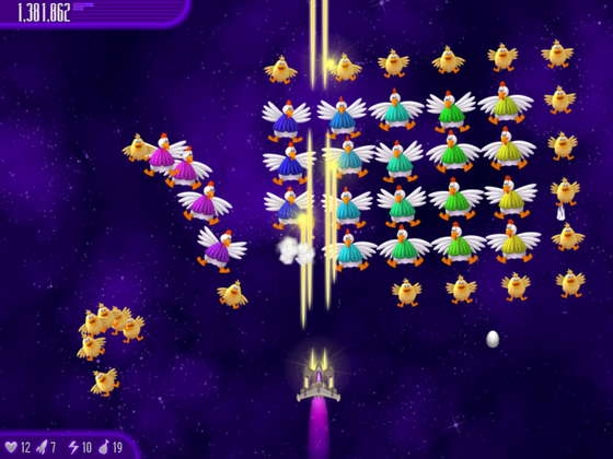 Межгалактические цыплята вторглись на землю, чтобы наказать человечество за притеснение их земных братьев. Вас ждет увлекательное путешествие по 12 звездным системам, 120 атак куриных захватчиков, 9 видов оружия, 30 бонусов и 15 медалей!