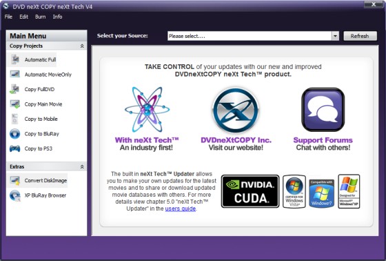 DVD neXt COPY neXt Tech - программа для копирования DVD. Программа позволяет делать резервные копии DVD фильмов. Предпросмотр трэков перед и во время копирования, поддержка однослойных и двухслойных дисков, мультиканального звука (Dolby digital 5.1, dts), поддержка NTSC и PAL DVD фильмов, делают эту программу одной из лучших в своём классе.
