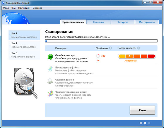 AusLogics BoostSpeed - популярная утилита для ускорения работы системы Windows, программ и Интернет-соединения от компании AusLogics. Программа оптимизирует компьютерную память, ускоряет загрузку Windows, повышает быстродействие Microsoft Office, The Bat, FireFox, Opera, Skype, чистит реестр и диск компьютера. Четвертая версия программы включает в себя знаменитый Auslogics Disk Defrag и набор новых утилит для современных компьютеров. После дефрагментации реестра BoostSpeed, скорость компьютера возрастет за счет уменьшения фрагментации файлов реестра, уменьшения их размера, а также благодаря устранению ошибок в реестре. Помимо этого данная программа предлагает мощные возможности очистки реестра и диска, что в свою очередь позволит вашему компьютеру работать более быстро и эффективно. Имеет приятный пользовательский интерфейс и поддержку русского языка.