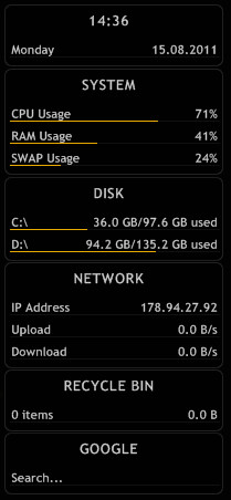 Программа для мониторинга ресурсов компьютера. Данная утилита позволяет отображать: график загрузки центрального процессора, количество свободной и занятой памяти компьютера (оперативной, виртуальной и дисковой). Кроме того, эта программа показывает сетевую информацию, а именно: IP-адрес, DNS-адрес, трафик, скорость использования канала отдельно по каждому из направлений. Также следует отметить такую возможность Rainmeter, как загрузка новостных лент и прогноза погоды. Данное программное обеспечение обладает информативным и приятным пользовательским интерфейсом, который с легкостью вписывается в окружение рабочего стола.