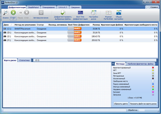 Данные в этой таблице отображаются в виде разноцветных квадратиков, расшифровку цвета которых можно посмотреть в главном окне PerfectDisk. Стоит отметить довольно быструю работу утилиты. Это связано с тем, что используется однопроходный метод дефрагментации с учётом S.M.A.R.T. данных винчестера. Может дефрагментировать не только локальные диски, но и с сетевые, причем в этом случае для облегчения настройки заданий используются профили сетевого планирования дефрагментации и полностью настраиваемое протоколирование работы. Поддерживаются работа с RAID-томами.