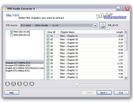 DVD Audio Extractor - небольшая программа, призванная помочь в «выдирании» саундтреков с дисков DVD и сохранения их в форматах OGG, MP3 или Wav. DVD Audio Extractor справляется с извлечением аудио из большинства форматов DVD-Video: Dobly Digital, MPEG-1 и MPEG-2, Liner PCM. Программа поддерживает пакетное выполнение заданий, благодаря этому Вы можете указать все аудиотреки, которые нужно извлечь и программа выполнит операции с ними одну за другой.