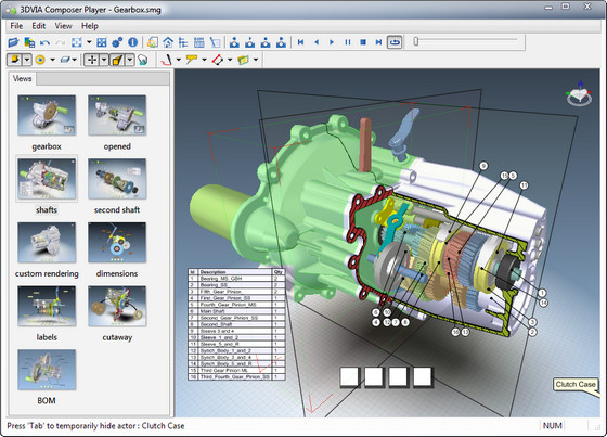 • 3DVia Player - бесплатная утилита, предназначенная для просмотра проектов 3DVia Composer. Эта утилита встраивается в интерактивные руководства 3DVia Composer (EXE-файлы), что позволяет просматривать эти документы на любом компьютере без специализированного программного обеспечения. 3DVia Player обеспечивает работу OLE-объектов, внедрённых в стандартные документы Microsoft Office, системы PDM (например ENOVIA SmarTeam) и web-сраницы.