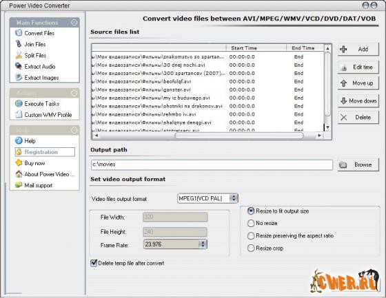 Power Video Converter - является конвертером между популярными видео форматами. Особенности: поддержка AVI, DivX, XviD, MPEG-4, MPEG1, MPEG2, VCD, SVCD, DVD, WMV, ASF, DAT, VOB форматов, пакетный режим конвертирования, высочайшая скорость конвертирования, поддержка PAL, NTSC видео, нарезка видео на фрагменты (ролики) по выбранному размеру или по временным позициям в встроенном проигрывателе, соединение фрагментов в один большой видео файл, извлечение аудио из видео и сохранение в mp3, wav, wma форматы, извлечение фрейма или разложение видео на последовательность bmp картинок, создание или загрузка wmv профиля, простой и удобный интерфейс, выбор и настройка кодеков, настройка параметров конвертирования, низкие системные и аппаратные требования.