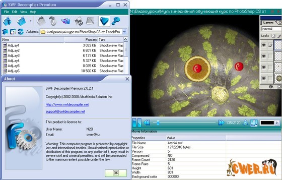 SWF Decompiler Premium - программа позволяет экспортировать Fla-данные, которые можно легко редактировать в родной среде Flash и конвертировать между .swf и .exe форматами. Все компоненты - изображения, звуки, скрипты, тексты, формы, фреймы, шрифты, кнопки и спрайты будут полностью экспортированы. Программа поделена на две части - в первой части вы выполняете все операции с файлами (открытие, редактирование и многое другое), во второй половине проигрыватель, с помощью которого вы сможете просмотреть не только flash-ролик, но и другие компоненты flash (картинки, звуки, шрифты, формы и т.д.) - довольно таки удобно при работе.