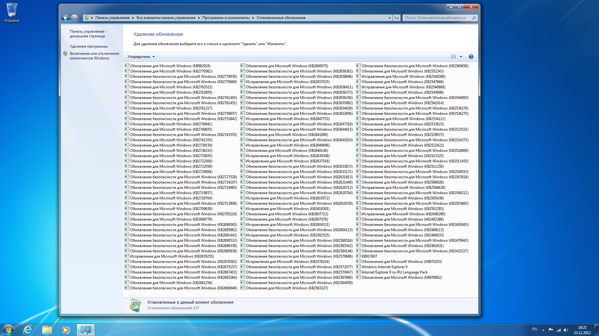 Выбор языка Рабочий стол Свойства диска Установленные обновления Internet Explorer