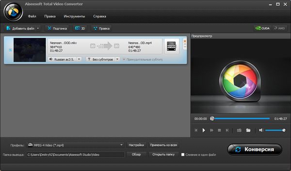 Aiseesoft Total Video Converter является многофункциональным программным обеспечением для конвертации видео в другие популярные форматы, такие как MP4, MKV, WMV, AVI, H.264/MPEG-4 AVC, FLV, 3GP, DivX, VOB, HD видео и другие. Кроме того, программа может извлекать аудио дорожки из видео файлов и конвертировать их в AAC, AC3, AIFF, MP3, M4V, MP2, WAV, WMA и другие аудио форматы. Также программа включает в себя и видео редактор с функциями обрезки видео, наложения водяных знаков, слияния нескольких видеофайлов в один и многое другое.