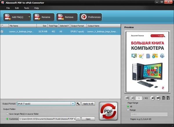 Aiseesoft PDF to ePub Converter — новая версия простого и удобного в работе инструмента, с помощью которого можно конвертировать с достаточно высоким качеством любые PDF документы в формат электронных книг ePub и читать их на Вашем iPad, iPhone, IPod Touch, Sony Reader и т.д. Вы сможете выбрать формат и кодировку текста, разрешение и качество изображений, задать размер и цвет выходного файла, конвертировать выбранные страницы или весь документ и многое другое. Поддерживается OCR технология и пакетная обработка файлов. Удобный и понятный интерфейс этой программы делает доступной работу как для продвинутых пользователей, так и для начинающих.