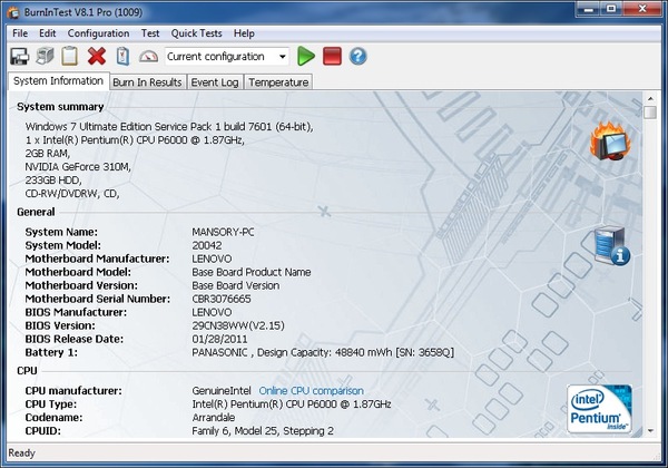 BurnInTest Professional - профессиональная версия программы для всестороннего и детального тестирования компонентов компьютера. Утилита тестирует скорость процессора, оперативную память, жесткие диски, CD/DVD приводы, звуковые карты, видеокарты, принтеры, сетевые соединения.