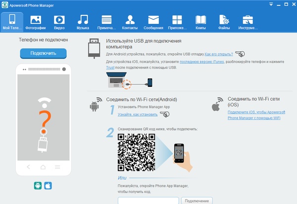 Apowersoft Phone Manager – это многофункциональная программа для управления файлами мобильных устройств, совместимая с большинством устройств на Android, iOS и Windows. Она синхронизирует мобильный телефон с компьютером для предоставления доступа к файлам (музыке, фотографиям, видео, приложениям, заметкам, sms-сообщениям, электронным книгам, журналам звонков и т.д.) и возможности управления ими. Более того, эта простая в использовании программа поможет копировать, восстанавливать, проверять файлы и перемещать их между вашим ПК и телефоном. Пользователи также могут подключать два устройства одновременно. Процесс настройки очень прост и может быть совершен с помощью USB-кабеля или соединения по Wi-Fi.