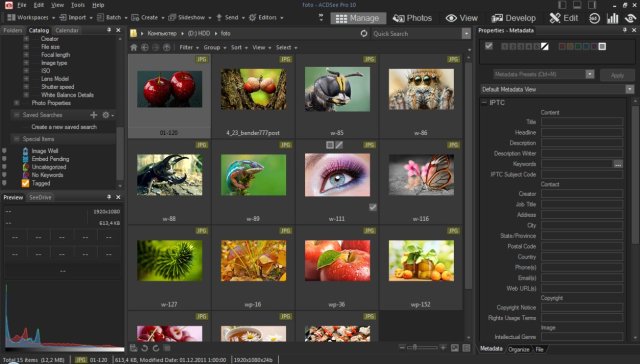 - обрабатывать RAW файлы - имеются мощные средства систематизации, такие, как настраиваемые папки и категории, функции быстрого редактирования, визуальная маркировка и поддержка управления цветом для ICC и ICM профайлов, которые отвечают всем профессиональным потребностям пользователей;