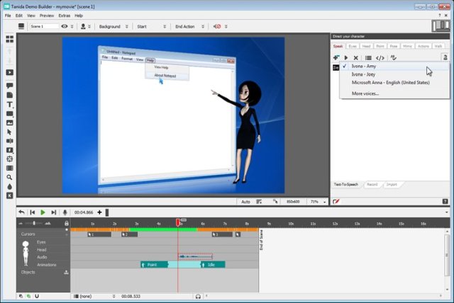 Demo Builder - программа для создания профессиональных презентаций, интерактивных обучающих роликов и прочих руководств. Имеет необходимые инструменты редактирования, добавления эффектов, работы с объектами и так далее. Автоматически захватывает все действия, производимые в запущенном приложении, позволяя затем редактировать ролики, добавлять аннотации, создавая при этом презентацию.