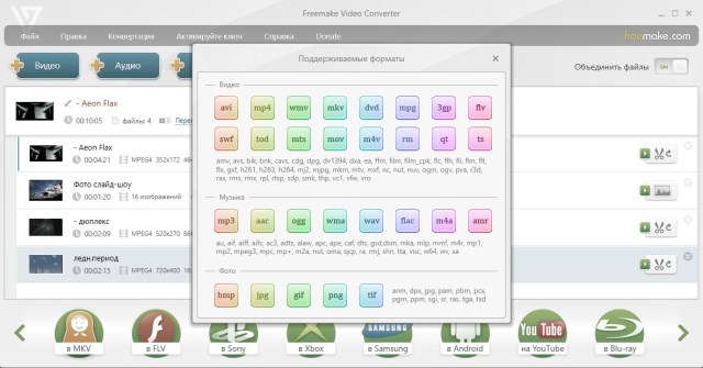 Freemake Video Converter - программа для быстрого преобразования и редактирования видео в популярные форматы (поддержка более 300 форматов), а также подготовки видео для просмотра на мобильных устройствах, создния слайд-шоу, извлечения звука из видеофайлов и другое.