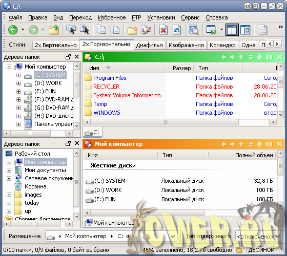 Мощная альтернатива Проводнику с настраиваемым интерфейсом, встроенным ftp-клиентом, внутренней поддержкой архивов, просмотром изображений, встроенным командным языком, настраиваемыми горячими клавишами для управления и очень большим числом других полезных при работе с файлами опций. Например, поиск дубликатов, безвозвратное удаление файлов, поддержка SSL и SSH/SFTP, конвертирование графики и т.д. CWER.ws рекомендует!