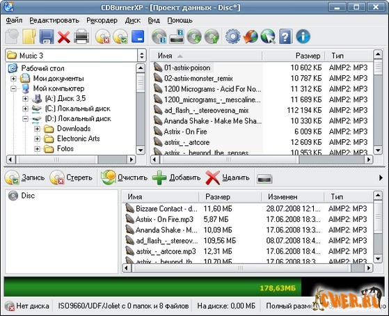 CDBurnerXP - программа для записи CD и DVD, включая Blu-Ray и HD-DVD. Пишет данные с жесткого диска и из ISO имиджей, записывает CD с данными и аудио-CD. Кроме этого, позволяет создавать загрузочные диски, переписывать аудиоCD на жесткий диск "на лету" в файлы MP3, OGG, WMA, WAV, а также сохранять образы CD в виде ISO-файлов. CDBurnerXP может работать как с обычными, так и с перезаписываемыми дисками и понимает "мультисессии".