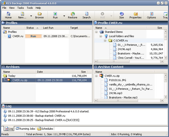Программа KLS Backup 2008 предназначена для архивирования и создания резервных копий Вашей важной информации. KLS Backup сжимает информацию в ZIP-архивы и позволяет их сохранять на любые накопители, включая сетевые и FTP-сервера. Работа программы достаточно быстра и корректна, возможность создания инкрементных копий поддерживается. В программе весьма неплохо организован планировщик заданий, а интерфейс программы будет понятен даже начинающим пользователям!