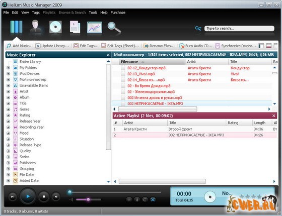 Helium Music Manager - продвинутый музыкальный менеджер, облегчающий систематизацию музыкальной коллекции. Представляет из себя одновременно редактор тегов и имн файлов по тегам, музыкальную базу-каталог и создатель плейлистов по ней. Так же, есть возможность создания отчтов по коллекции и быстрый поиск по базе. Немаловажными плюсами является корректная работа со сменными девайсами (CD/DVD) - файлы с них отображаются отдельно, поиск обложек/обзоров/названий треков по различным сервисам, запись CD/DVD, поддержка плагинов, есть даже плагин для Winamp и многое другое. Программа совместима с Windows Vista.