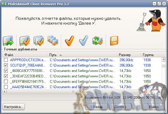 - Удобные средства для группового выделения найденных файлов: выделение всех файлов принадлежащих указанному каталогу, выделение всех файлов идентичных указанному.
