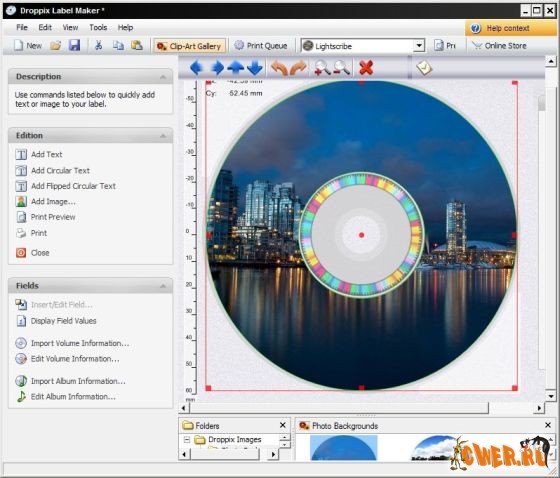 Программа для создания и печати высококачественных наклеек для дисков CD и DVD. Для создания наклеек Droppix Label Maker имеет профессиональные инструменты редактирования и большое количество шаблонов, изображений и шрифтов, которые можно использовать в дизайне этикеток. Программа работает как с технологией LightScribe (нанесение монохромных рисунков на поверхность диска), так и с любыми принтерами, которые печатают на CD/DVD.