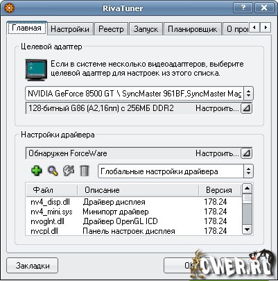 RivaTuner - полномасштабная среда для настройки любых видеокарт, основанных на графическом процессоре NVIDIA. Широчайший набор опций настройки API Direct3D/OpenGL и системы на уровне драйвера, гибкая система шаблонов, позволяющая устанавливать опции для каждого приложения индивидуально, уникальные возможности по диагностике и аппаратному мониторингу в реальном времени и мощные инструменты, такие как встроенный редактор реестра и скриптовый механизм реализации патчей делают инструментарий RivaTuner непревзойдённым...
