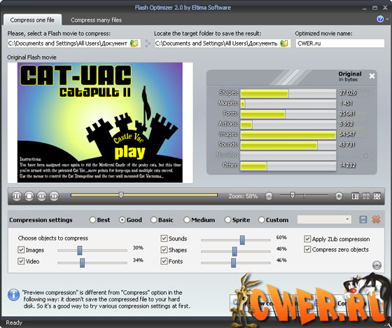 Более 50 различных опций сжатия позволяют полностью контролировать процесс оптимизации и получать отличные результаты без потерь в качестве. Eltima Flash Optimizer предоставляет значительные возможности пользователям Flash, позволяя экономить трафик, время, место на сервере и в конечном итоге деньги!