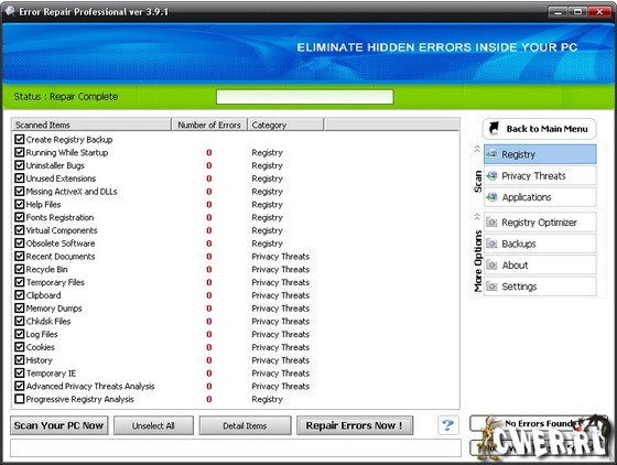 Error Repair Professional - это небольшая утилита для исправления ошибок в настройках операционной системы. Программа обладает высокой скоростью работы и за считанные секунды проверит ваш компьютер на наличие ошибочных записей и сама исправит их. Для продвинутых пользователей присутствует ручной режим работы. Найдет неполадки в реестре, библиотеках данных системы и приложений, а также серьезные ошибки, допущенные пользователем, ставящие безопасность системы под угрозу.