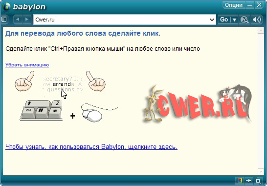 Babylon - словарь, позволяющий переводить слова с одного языка на другой. Работать со словарем очень просто: после нажатия кнопкой мыши (какой кнопкой - настраивается) на интересующее слово появляется окно с его переводом. Кроме перевода слов, Babylon включает в себя тематические и толковые словари, а также имеет функции конвертации валют на текущую дату и перевода мер из одной системы в другую.
