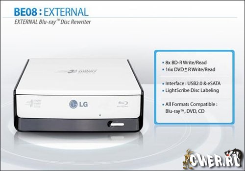 Компания LG Electronics анонсировала выпуск внешнего пишущего оптического Blu-ray привода LG BE08, способного "прожигать" диски BD-RW на скорости 8х (по заявлениям разработчиков, на полную запись 25-гигабайтной "болванки" такого формата уйдёт всего 13 минут).