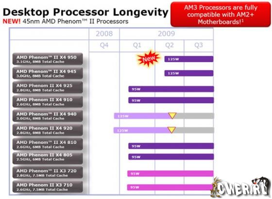До недавнего времени считалось, что наиболее мощным 45-нм настольным процессором AMD будет модель Phenom II X4 945 с тактовой частотой 3,0 ГГц, премьера которой намечена на апрель текущего года. Другие же чипы в исполнении Socket AM3, анонс большинства из которых запланирован на следующий месяц, функционируют на частотах, не превышающих отметку в 2,8 ГГц. Однако благодаря информации, обнародованной китайским сетевым ресурсом PConline.com.cn со ссылкой на свежий роадмап AMD, стало известно о том, что в первой половине второго квартала 2009 года чипмейкер собирается представить новинку под названием Phenom II X4 950, тактовая частота которой равна 3,1 ГГц.