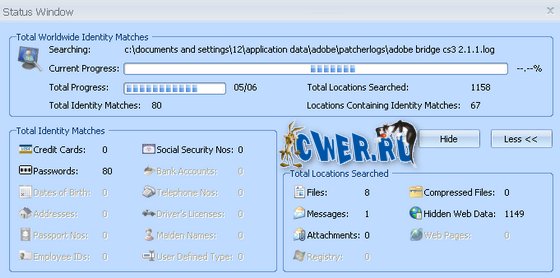 Identity Finder Professional - идентификатор-поисковик всего ценного что можно угнать-украсть у вас с компьютера! Вы можете и не знать где и что у вас находится, но хакер точно знает где искать номера ваших кредитных карт, пароли и логины, регистрационные номера установленного коммерческого софта, номера телефонов родных, друзей и сослуживцев и много других мест где можно отлично поживится, куда программы складывают вами внесенные данные. Программа Identity Finder Professional позволяет по умолчанию найти эти чувствительные данные и позволить вам их блокировать от копирования, шифровать или удалить без возможности восстановления специальным софтом, еще до того пока у вас их украдут. Имеет гибкие настройки для конкретного случая и установку поиска по индивидуальным критериям. Программа имеет понятный интерфейс в стиле Office 2007.