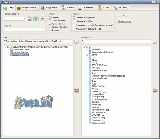 - Four synchronization modes, copy, update, mirror and equalize.