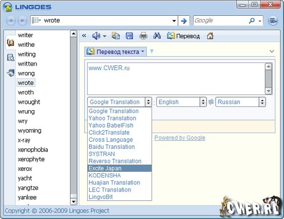 В Lingoes Translator присутствует функция произношения переводимого слова или текста, использующая технологию преобразования текста в речь. На сайте разработчиков можно найти множество словарей и тезаурусов, которые постоянно обновляются и корректируются. Кроме того, здесь есть встроенные средства для перевода текста с помощью известных онлайн-сервисов перевода в Интернете.