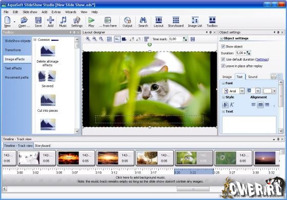 AquaSoft SlideShow Studio - мощная программа для создания мультимедийных DVD. Фото, видео, аудио, слайд-шоу — всё это вы можете смотреть на своём ТВ. Обширное количество эффектов перехода, настраиваемых текстовых эффектов. Более чем 100 текстовых эффектов, одушевлённые прозрачные и плавающие шрифты и объекты. Возможно наложение звука, музыки и голоса на многие параллельные треки, создание сложных объектов и многое другое.