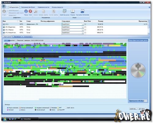 Raxco PerfectDisk - программа для дефрагментации жёсткого диска. Оптимизирует при своей работе файл подкачки, MFT таблицу, а также физическое расположение на жёстком диске файлов и директорий. Для того чтобы начать дефрагментировать какой-либо диск, нужно выбрать сам диск и нажать кнопку запуска. При своей работе программа показывает изменяющуюся графическую таблицу, в которой в реальном времени отображается процесс дефрагментации.Данные в этой таблице отображаются в виде разноцветных квадратиков, расшифровку цвета которых можно посмотреть в главном окне PerfectDisk. Стоит отметить довольно быструю работу утилиты. Это связано с тем, что используется однопроходный метод дефрагментации с учётом S.M.A.R.T. данных винчестера. Может дефрагментировать не только локальные диски, но и с сетевые, причем в этом случае для облегчения настройки заданий используются профили сетевого планирования дефрагментации и полностью настраиваемое протоколирование работы. Поддерживаются работа с RAID-томами.