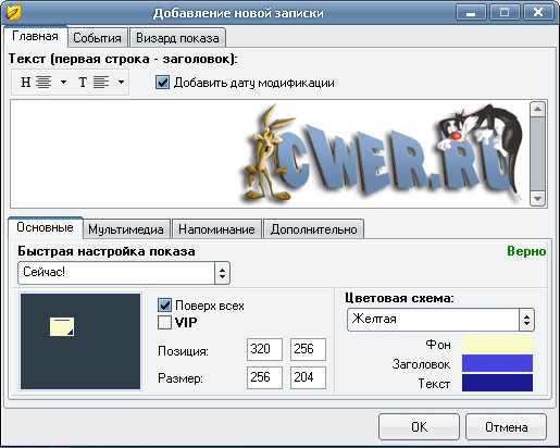 - детально настраивать дату и время напоминания с помощью "Визард показа"