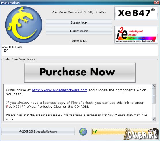 Arcadia PhotoPerfect - отличный графический редактор нового поколения. Имеет все современные средства редактирования и ретуширования, включая алгоритм Xe847, алгоритм, действующий на основе данных, полученных при исследовании работы зрительных центров человеческого мозга для однокликового или полноценного "вытаскивания" из снимков качества изображения, а также интеллектуальной функцией ретуширования исправления или удаления дефектов.