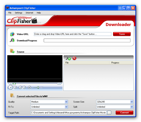 Ashampoo ClipFisher - программа для просмотра и сохранения потокового видео из интернета на компьютере. Для работы с утилитой достаточно указать веб-адрес потокового вещания и программа сохранит выбранный фильм в форматах FLV или WMV. Кроме того, программа позволяет указать качество, с которым будет сохраняться видео, а также ограничить размер конечного файла, при достижении которого, запись будет прекращена. При необходимости средствами утилиты можно просмотреть загружаемый видео файл. Работает с интернет-сервисами YouTube, VideU, MyVideo, ClipFish и GoogleVideo. Имеет удобный и понятный пользовательский интерфейс.